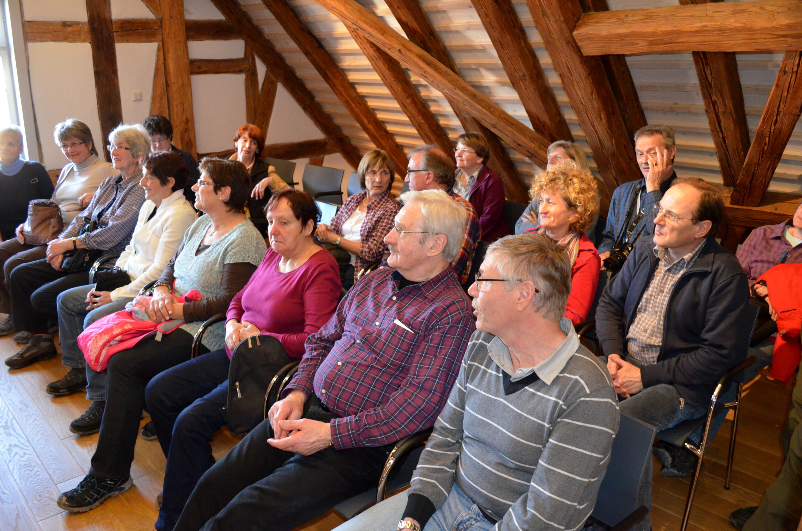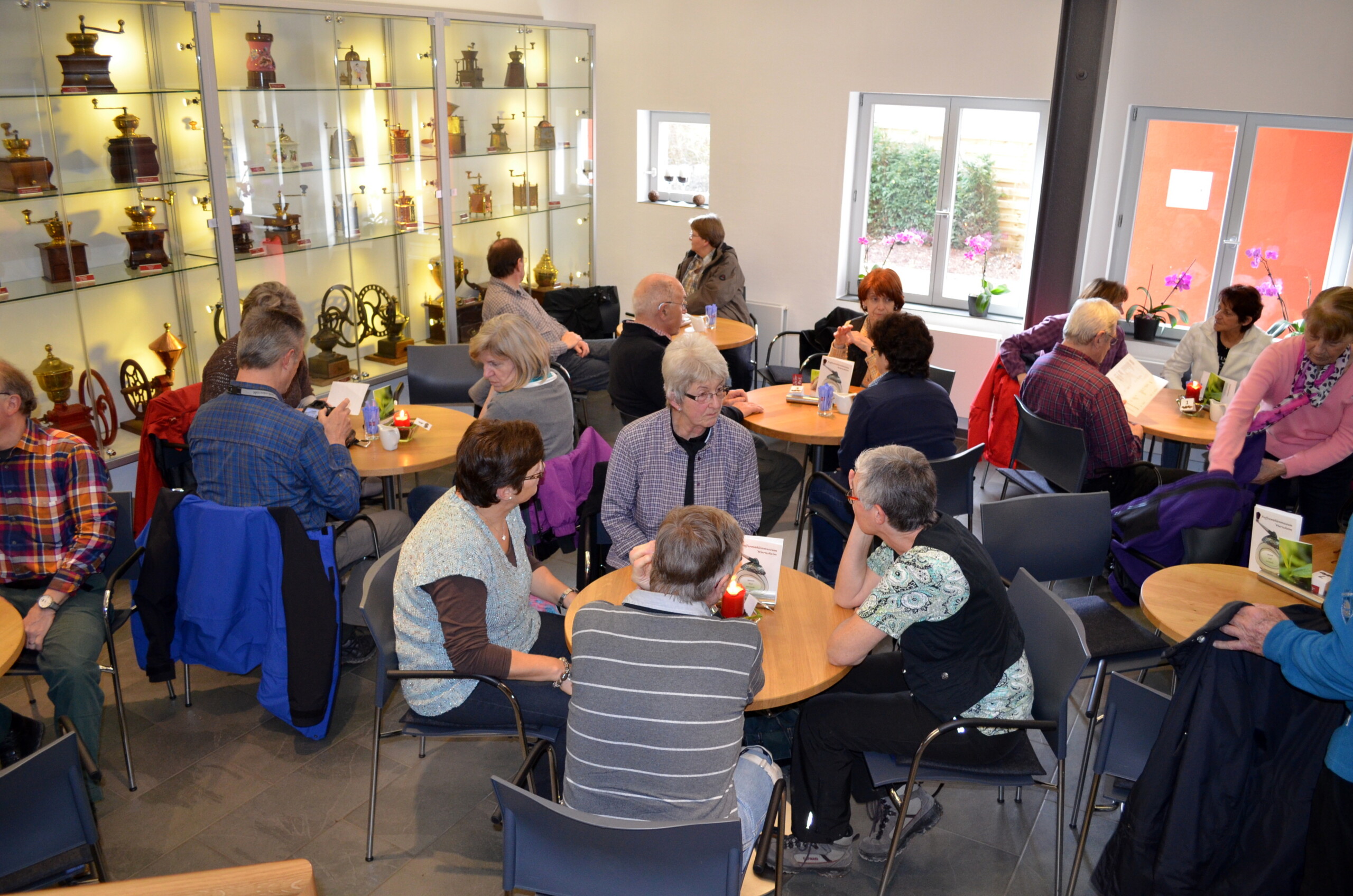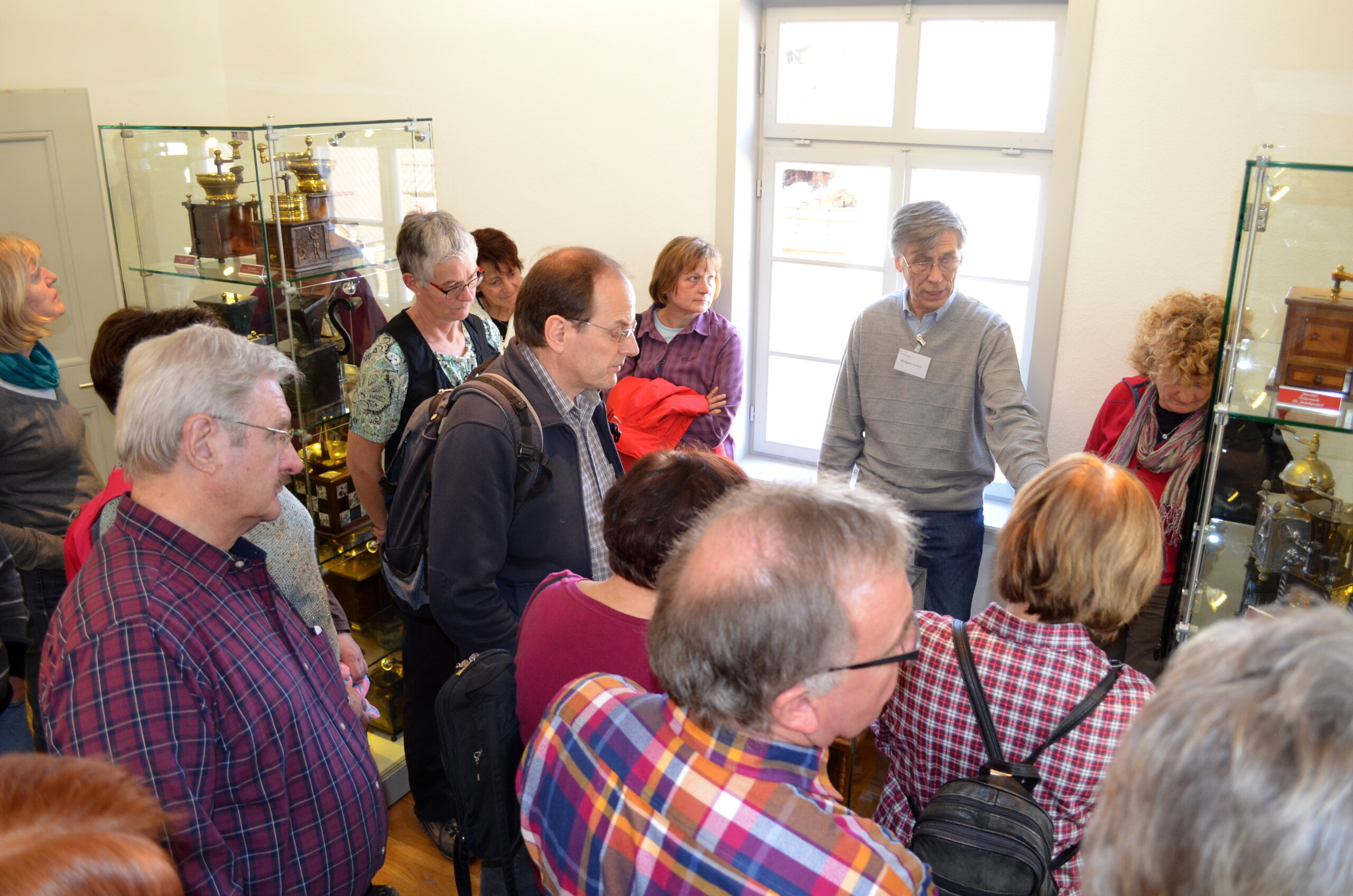 Im vollbesetzten Bus fuhren wir nach Mönsheim. Mitten drin, aber ein wenig versteckt, liegt diese Heckengäu Gemeinde im romantischen Grenzbachtal. Die Fachwerkhäuser des alten Dorfkerns schmiegen sich an den dominanten dicken Turm, einem Bergfried aus dem 13.Jahrhundert. Dem Grenzbach entlang, am Paulinensee vorbei folgten wir dem Wanderzeichen des „Gäurandweges“ im aussichtsreichen Heckengäu. Das Heckengäu bildet von Norden nach Süden ein über 50 km lang gezogenes Band. Die Gegend ist geprägt durch Streuobstwiesen und Wacholderheiden, aber vor allem durch Feldhecken, die sich auf Steinriegel bildeten. Auf Grund seines verkarsten Muschelkalkuntergrunds ist das Heckengäu eine trockene Region. In dieser Muschelkalklandschaft liegt die Gemeinde Wiernsheim, auf der sogenannten „Platte“ mit Steilabfall zum Enztal hin. Wiernsheim befand sich ab 1259 im Besitz des Klosters Maulbronn. Als das Kloster nach dem Erbfolgekrieg 1504 württembergisch wurde, kam auch Wiernsheim zu Württemberg. Dort besuchten wir das größte Kaffeemühlenmuseum Deutschlands, wo für zwei Gruppen eine Führung bestellt war.